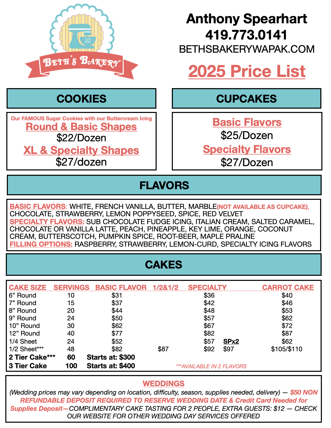Thankfully, we are excited to announce that beginning during the 2023 Holiday season we were able to lower our prices as most of our ingredients return to more reasonable prices. Though things like our Carrot Cake ingredients have increased this year most of our products have decreased. We promised back in 2022 that when we saw lower costs that we would pass them onto you our customers. We are so happy that we can now fulfill that promise! Below you will find the updated pricing list for 2024.